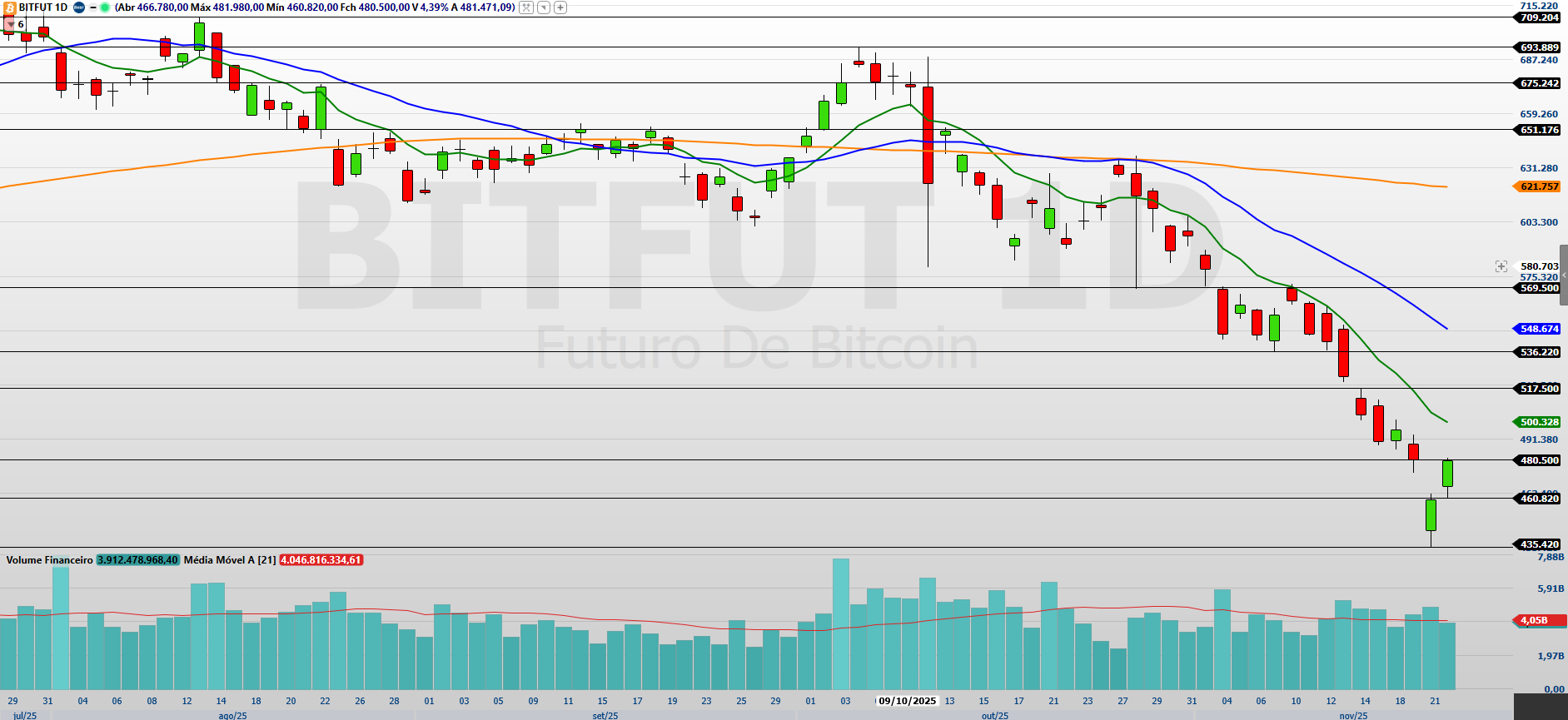 Os contratos de Bitcoin (BITX25), com vencimento em novembro, encerraram a última sessão em forte alta de 4,39%, cotados aos 480.500 pontos. O movimento representou uma recuperação relevante após uma sequência de quedas expressivas, em meio à continuidade do cenário de alta volatilidade que tem caracterizado os últimos pregões.