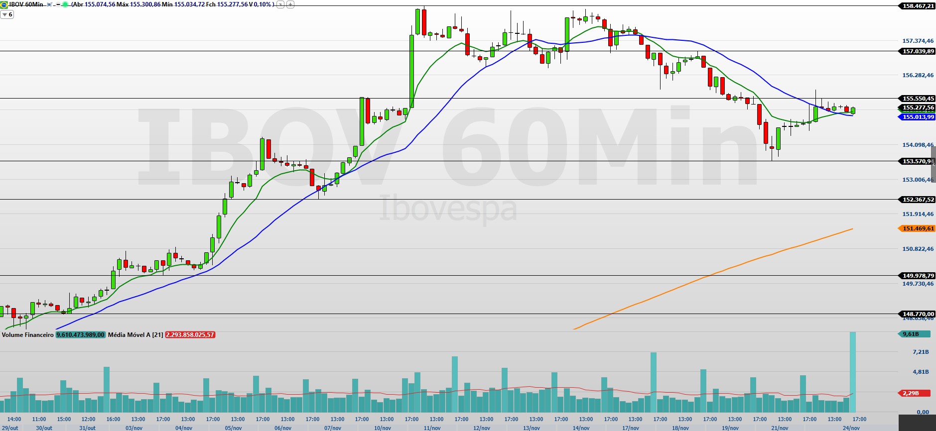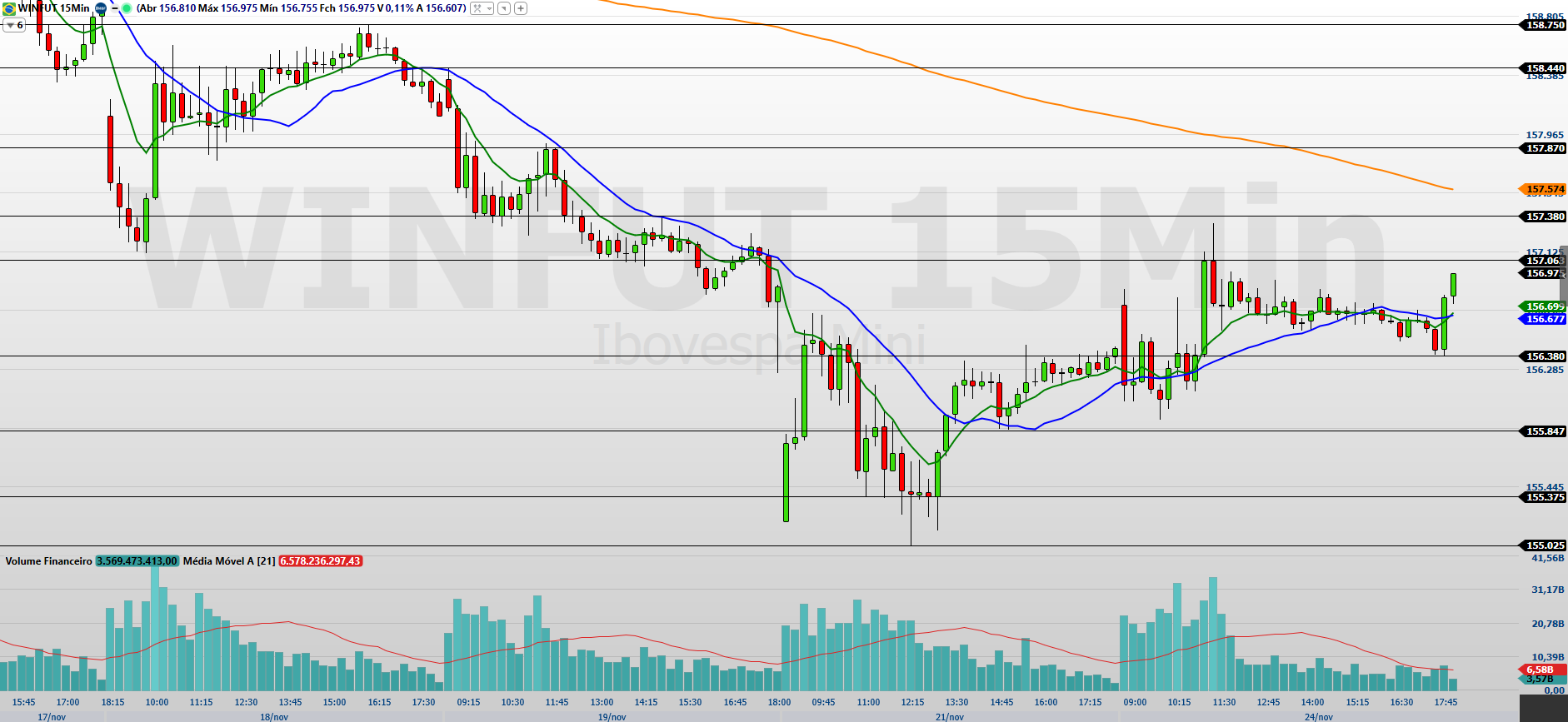 O mini-índice (WINZ25) encerrou a última sessão (24/11) em alta de 0,31%, aos 156.975 pontos.
