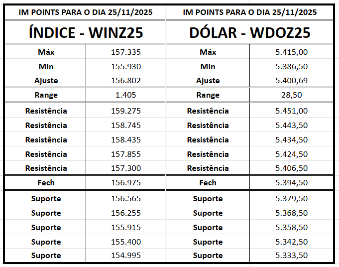 Já para o lado vendedor, o gatilho segue claro: perda dos suportes em 155.000/153.570 pontos. Se esse patamar for rompido, o fluxo vendedor tende a se intensificar, levando o índice a buscar 152.367/151.470 pontos e, em cenário mais pressionado, a região de 149.975/148.770 pontos.
