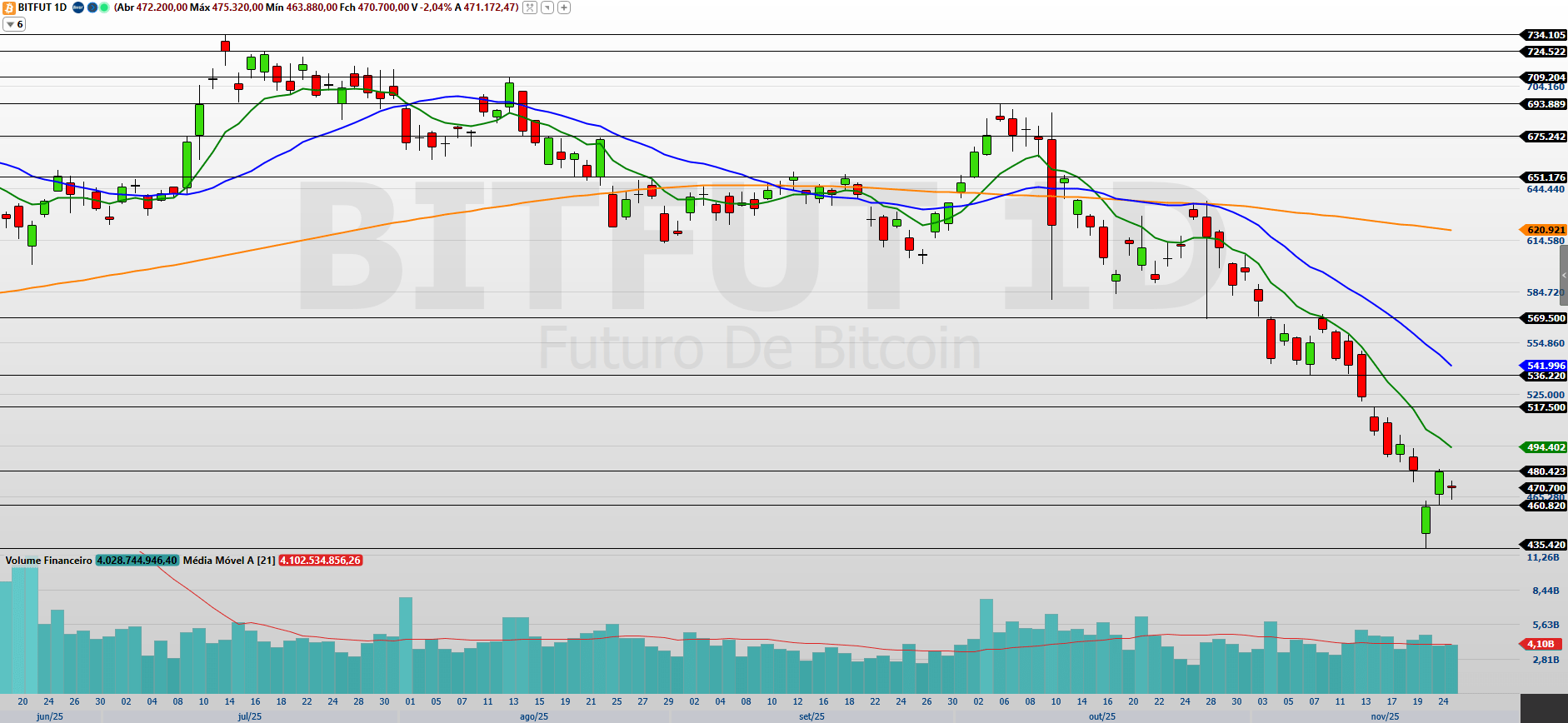 Os contratos de Bitcoin (BITX25), com vencimento em novembro, encerraram a última sessão em queda de 2,04%, aos 470.700 pontos, refletindo a volatilidade intensa que tem marcado as últimas semanas e a manutenção do viés vendedor no curto prazo.