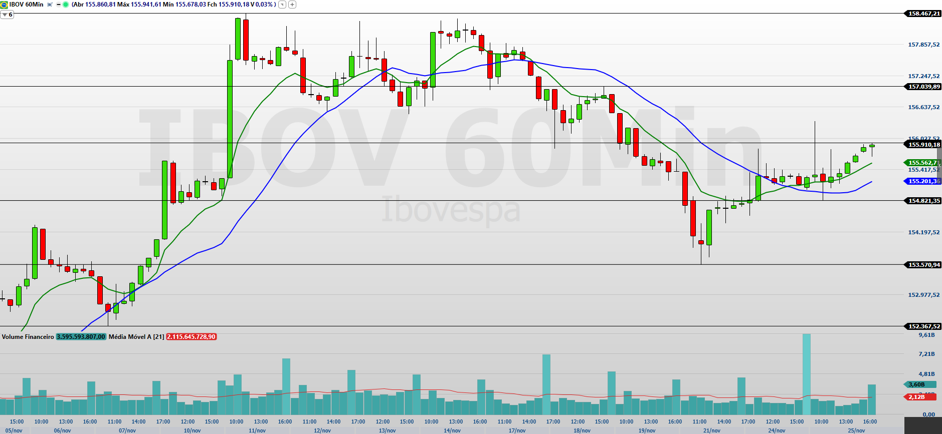 O Ibovespa encerrou a última sessão (25/11) no positivo, avançando pela segunda vez consecutiva e reforçando o movimento de recuperação. O índice subiu 0,41%, fechando aos 155.910 pontos, após oscilar entre a mínima de 154.821 pontos e a máxima de 156.373 pontos. Mesmo após a correção recente, o benchmark segue acima dos 150 mil pontos e mantém no radar a máxima histórica em 158.467 pontos, cuja quebra pode destravar novo impulso comprador.