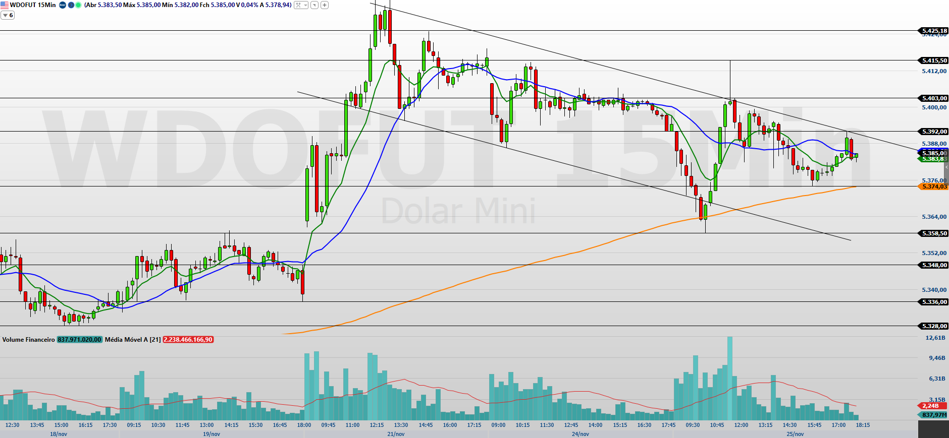 Os contratos de minidólar (WDOZ25), com vencimento em dezembro, encerraram a última sessão (25/11) em baixa de 0,18%, cotados a 5.385 pontos