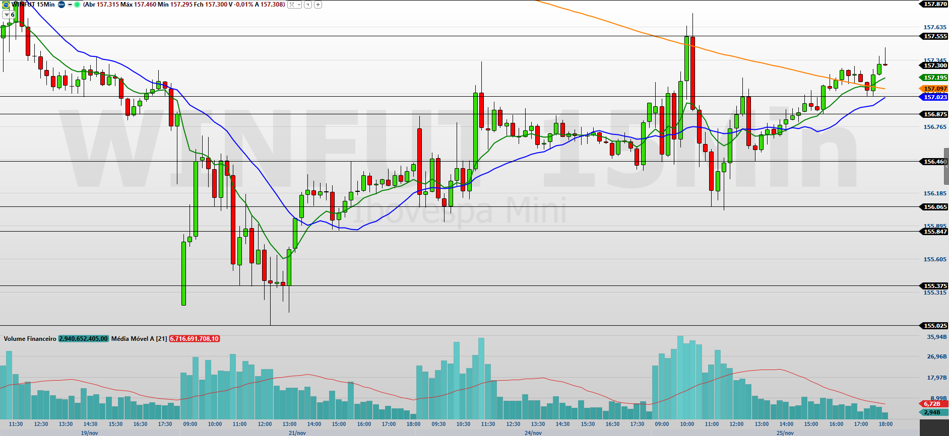 O mini-índice (WINZ25) encerrou a última sessão (25/11) em alta de 0,26%, aos 157.300 pontos.