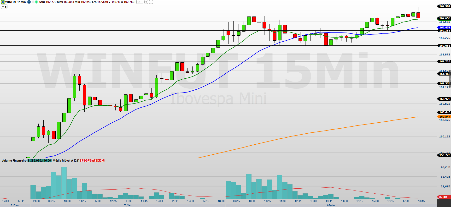 Nos 15 minutos, observo o ativo consolidando a segunda alta consecutiva e mantendo-se acima das médias de 9 e 21 períodos. O gatilho para continuidade da pressão compradora será a quebra da resistência em 162.900/163.135, que abriria espaço para avanços até 163.425/163.945, com alvo estendido em 164.170/164.475.