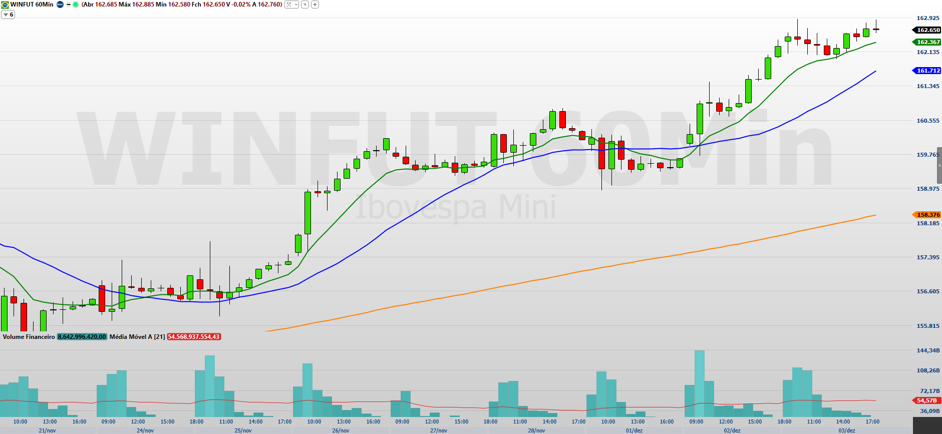 Nos 60 minutos, o mini-índice também encerrou em alta e segue negociando acima das médias de 9 e 21 períodos, mantendo a leitura estrutural positiva.